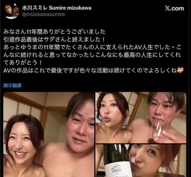 她是在自己的X上公布现场照,引退作品最后是由知名男优贞松大辅(サダさん)完成了她的Last Shot;回顾过去11年(她当然是把刚出道水稀みり的时期算进去)的业界生涯,水川スミレ(水川蓳)说自己从没想过能坚持那么久,真的非常感谢大家让她的人生变得如此美好〜